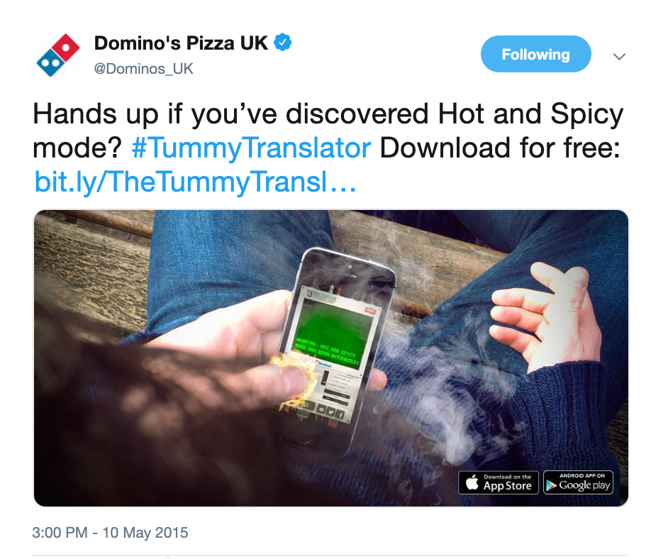 Can't decide what to eat? Let the world's first Tummy Translator app help you decide. Hold it against your tummy and it will translate your rumbles into specific food suggestions, which you can then order from Domino's.