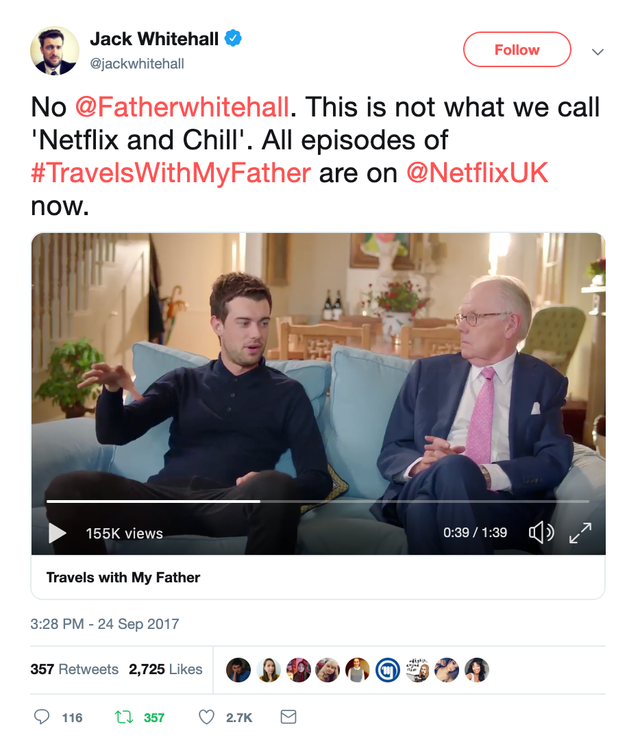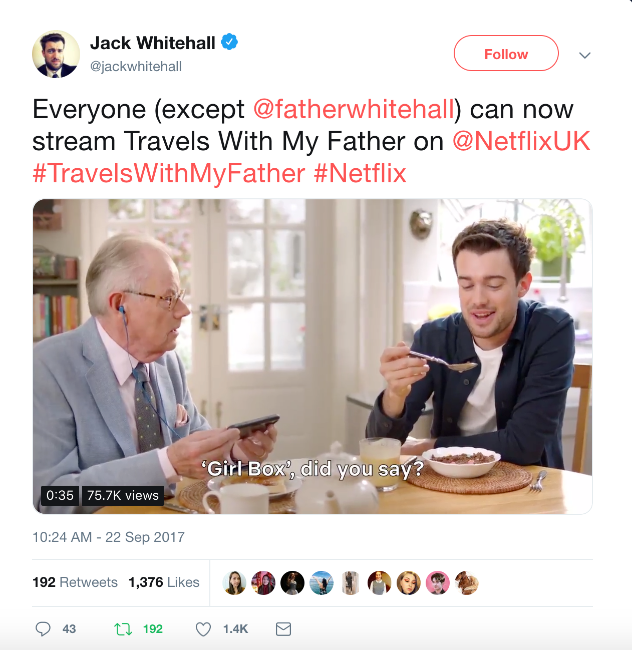 In 2017 Jack Whitehall was everywhere. To make sure everyone knew his latest show 'Travels With My Father' was a Netflix Original, we filmed Jack trying to explain to his father what Netflix was.